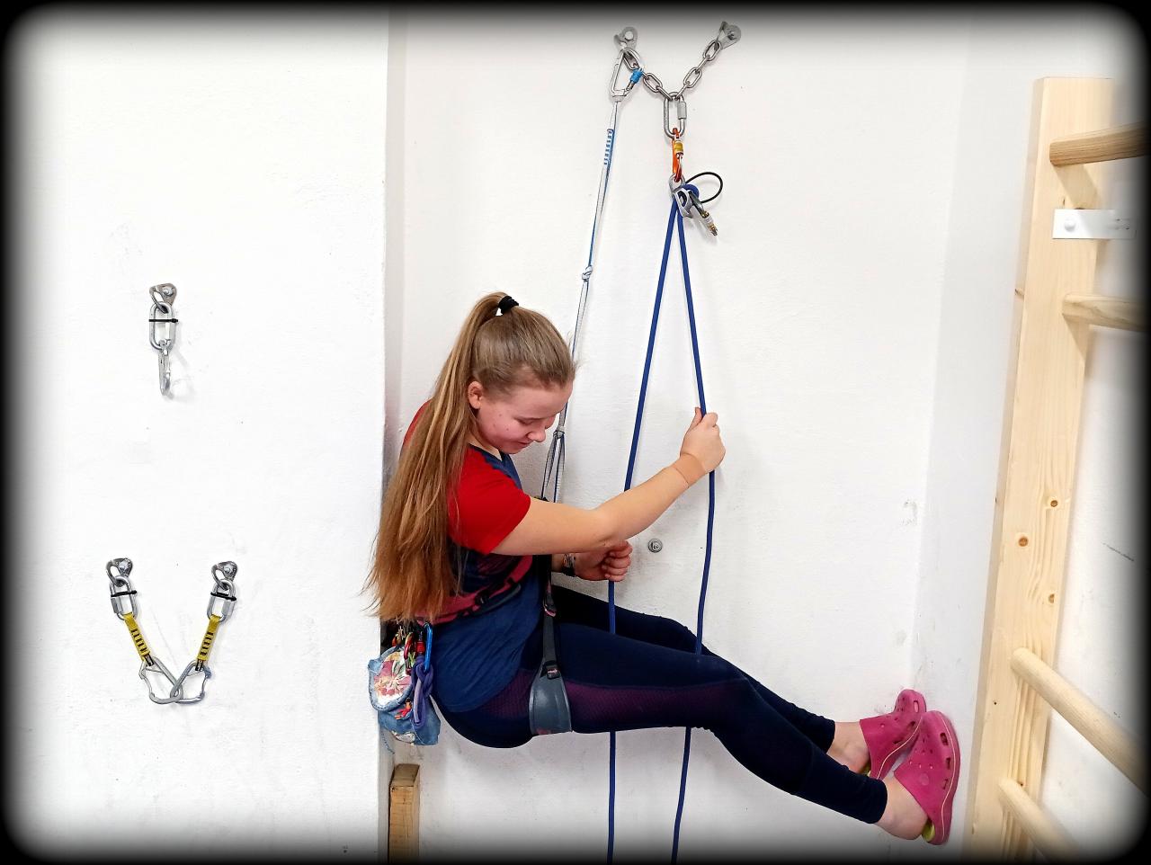 Cena zahrnuje instruktora, lano, jistící pomůcky, karabiny, pomocné šňůry a smyčky, expresky pro nácvik zacvakávání lana, a vstupné na stěnu.